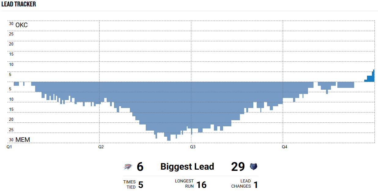Let's focus on OKC's comeback. Yesterday, we saw ESPN's win probability chart. Today, let's explore the NBA's lead tracker to see the game's momentum shifts.