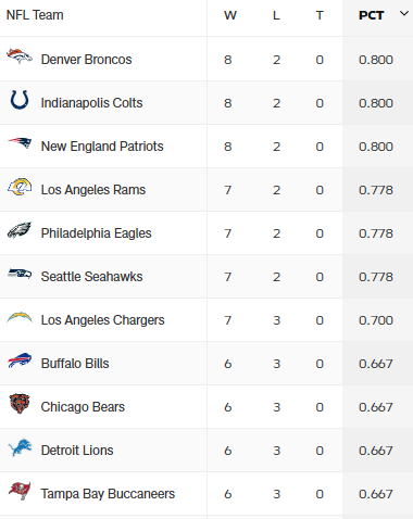 Biggest news: With that record, the Patriots are tied with the Broncos and Colts at the top of the NFL standings.