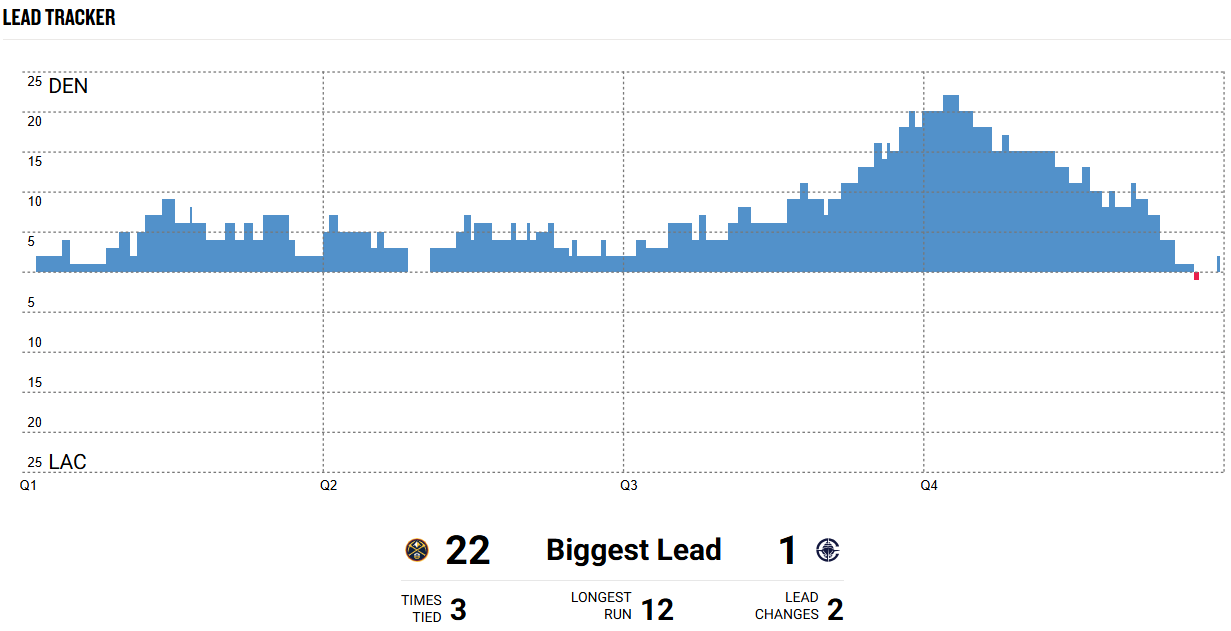 Both Clippers-Nuggets and Thunder-Grizzlies were decided by just 2 points! Look at the NBA lead tracker chart for Clippers-Nuggets and see how the Nuggets almost blew a 22 point 4th-quarter lead before the buzzer beater.