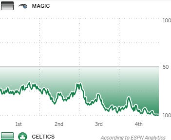 The lowest the Celtics' chance of winning ever got was 66% with 3 minutes left in the first quarter when Paolo Banchero hit a jumper and the Magic took the lead 17-16. The percentage was similar (68%) in the third quarter when the Magic's Franz Wagner cut the Celtics lead to 50-49, but with 5 minutes left in the 4th quarter the Celtics led 96-85 and had a 98% chance to win.