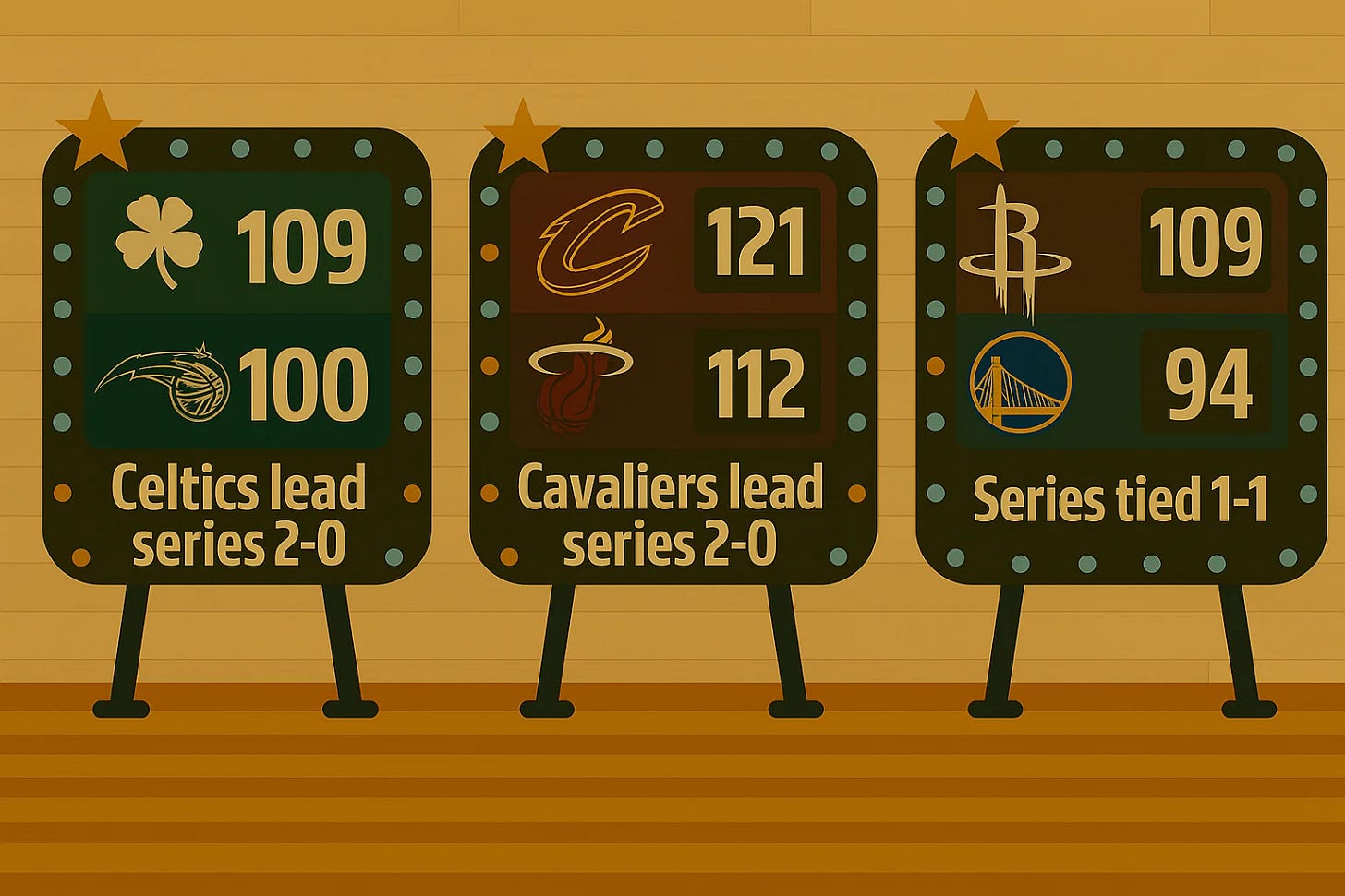 Remember, we expected the Celtics to beat the Magic (~85% chance), Cavaliers to beat the Heat (also ~85%), and Rockets to beat the Warriors (~60%). Let's go to the scoreboard: