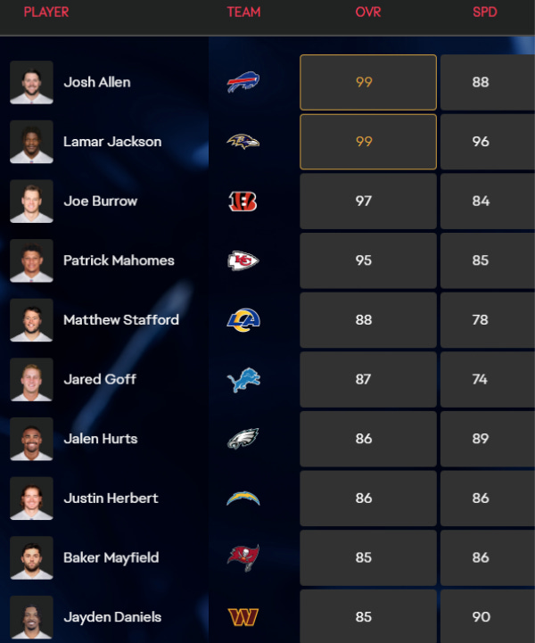 He’s the only quarterback besides Josh Allen with a perfect 99 overall.