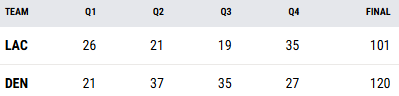 Nuggets dominated the Clippers 120–101 with a balanced offensive attack, including 6 players with 15+ points (Aaron Gordon led with 22 points)